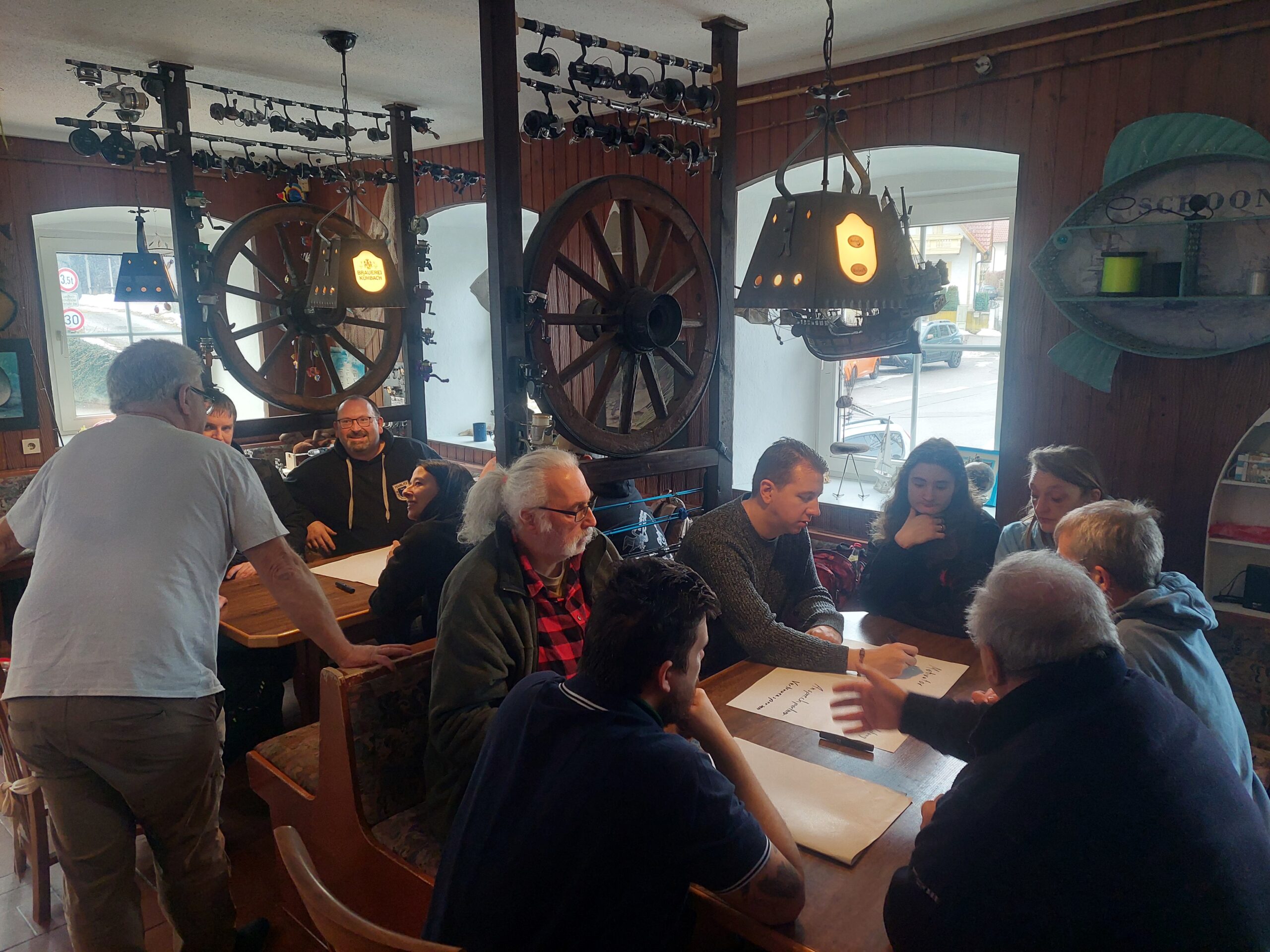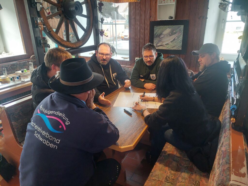 Der Seminartag begann mit einem Vortrag zu Pädagogik. Der Begriff der „Selbstwirksamkeit“ stand hier im Fokus. Denn das Vertrauen darin, Herausforderungen und Problemsituationen selbstständig lösen zu können, ist ein extrem wichtiger Bestandteil für die Entwicklung unseres Nachwuchses. Dominik Hunoltstein, Bildungsreferent der Bayerischen Fischerjugend, gab hierzu einen Einblick in die Thematik. Das Angeln und die fischereiliche Jugendarbeit nehmen hier eine sehr positive Funktion ein. Herausforderungen bei der Ausübung unseres Hobbys sind immer gegeben: Witterungsbedingungen, Wasserstand, Wassertemperatur, Tageszeit, und vieles mehr – beim Angeln reagieren wir auf immer neue Situationen, suchen Lösungen und kommen dadurch zum Erfolg. Gleiches gilt eben auch für die eigenhändige Reparatur von Angelgerät. Nach dem theoretischen Input arbeiteten unsere Jugendleitungen, eingeteilt in zwei größere Gruppen, ihre Rolle für unseren Nachwuchs in den Jugendgruppen stichpunktartig aus. Schnell stellte sich der enorme Mehrwert für unseren Nachwuchs durch ihr Ehrenamt heraus. Das Wissen um die Selbstwirksamkeit hört auch bei den Erwachsenen nicht auf!
