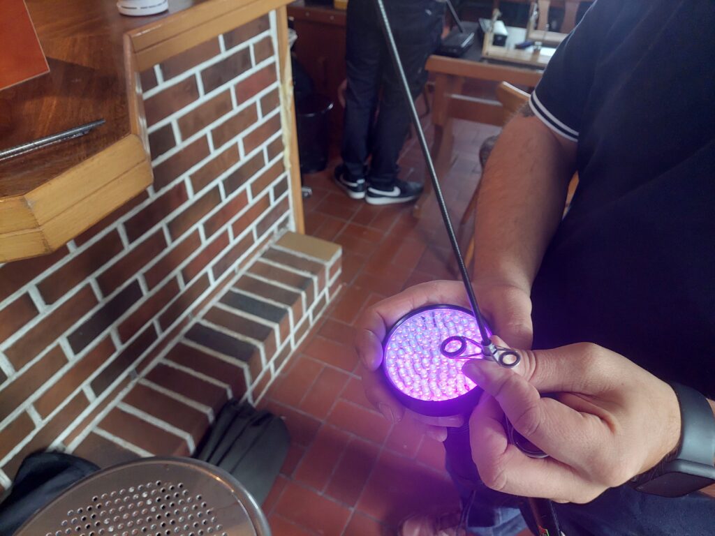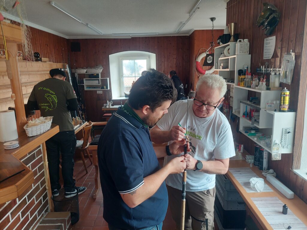 Besonders interessant war auch die Ermittlung des richtigen Wurfgewichts anhand einer speziellen Berechnungsmethode, in Verbindung mit einem Meterstab und unterschiedlichen Gewichten. So bildeten sich schnell Gruppen mit unterschiedlichen Schwerpunkten, vom Wickeln neuer Rutenringe bis zum Anbringen neuer Rutengriffe sowie alles dazwischen waren alle Anwesenden gefordert. Für kleine Reparaturarbeiten braucht es nicht mal großes Werkzeug, doch auch anspruchsvollere Maßnahmen waren Teil des Seminartags. Währenddessen gab es immer wieder tolle Beiträge und Diskussionen unter den Anwesenden. Besonders erfreulich war wieder die tolle Gemeinschaft und gegenseitige Unterstützung untereinander.