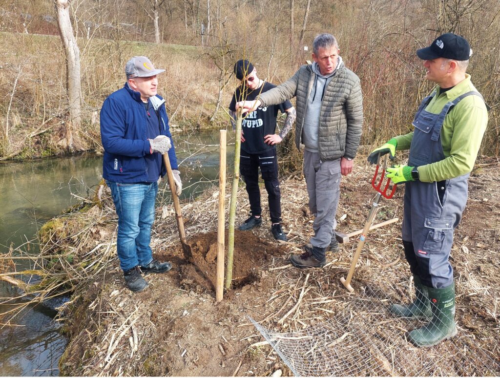 Die zuvor erwähnten theoretischen Inhalte gingen direkt in die angewandte Praxis über. Am ersten Seminartag führten unsere Teilnehmenden eine Gewässeranalyse durch. Dabei wurde die Struktur ebenso erfasst, wie die chemische Zusammensetzung des Wassers. Außerdem begutachteten wir den für uns relevanten Bereich des Prunner Bachs und diskutierten mögliche Maßnahmen, wie Strukturverbesserung, Beschattungsmaßnahmen und Kiesbett-Auflockerung. Am zweiten Seminartag ging es dann richtig zur Sache! Mithilfe eines Baggers brachten wir zwei große Wurzelstöcke in das Gewässer ein, um die Strukturgüte und die Strömungsvarianz zu verbessern. Dies verkürzte die dafür nötige Arbweitszeit um einige Stunden, sodass wir weitere wichtige Praxiseinheiten durchführen konnten. Eine Umsetzung mit der Jugendgruppe ist in angepasster Form, ohne Bagger, definitiv möglich. Unsere Anwesenden legten danach gemeinsam Faschinen zur Ufersicherung an, lockerten Kieslaichplätze auf und brachten Nistkästen für die Wasseramsel an. Außerdem pflanzten wir Weidenstecklinge zur Gewässerbeschattung, für die direkt effektive Schutzmaßnahmen vor Biberverbiss aufgezeigt und angewendet wurden.