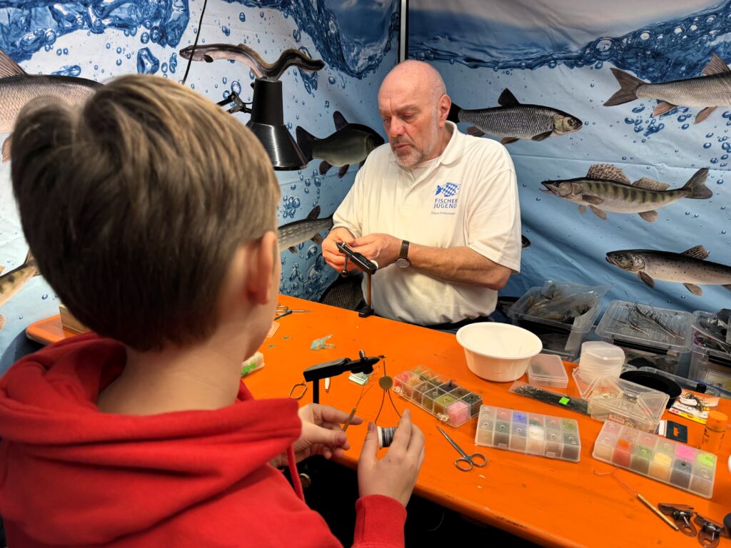 Vor allem das Wobblerbemalen entwickelte sich wieder zu einem Publikumsmagneten für die jüngeren Messegäste. Mit viel Kreativität gestalteten Kinder ihre eigenen Kunstköder. Theresa Besendorfer, Jugendsprecherin des Fischereivereins für Kinder & Jugendliche Prien e. V. und Auszubildende zur Fischwirtin, betreute das Angebot engagiert und sorgte mit Fischtattoos für zusätzliche Begeisterung. Parallel dazu bot die Bayerische Fischerjugend Fliegenbinden an. Horst Burgstaller vom Verein Die Isarfischer e. V. sowie Klaus Fellermeier, Bezirksjugendleiter Niederbayern, erklärten die einzelnen Arbeitsschritte und unterstützten die Teilnehmenden fachkundig. Neben klassischen Fliegen entstanden auch Ohrringe aus Naturmaterialien, die besonders bei Jugendlichen großen Anklang fanden.