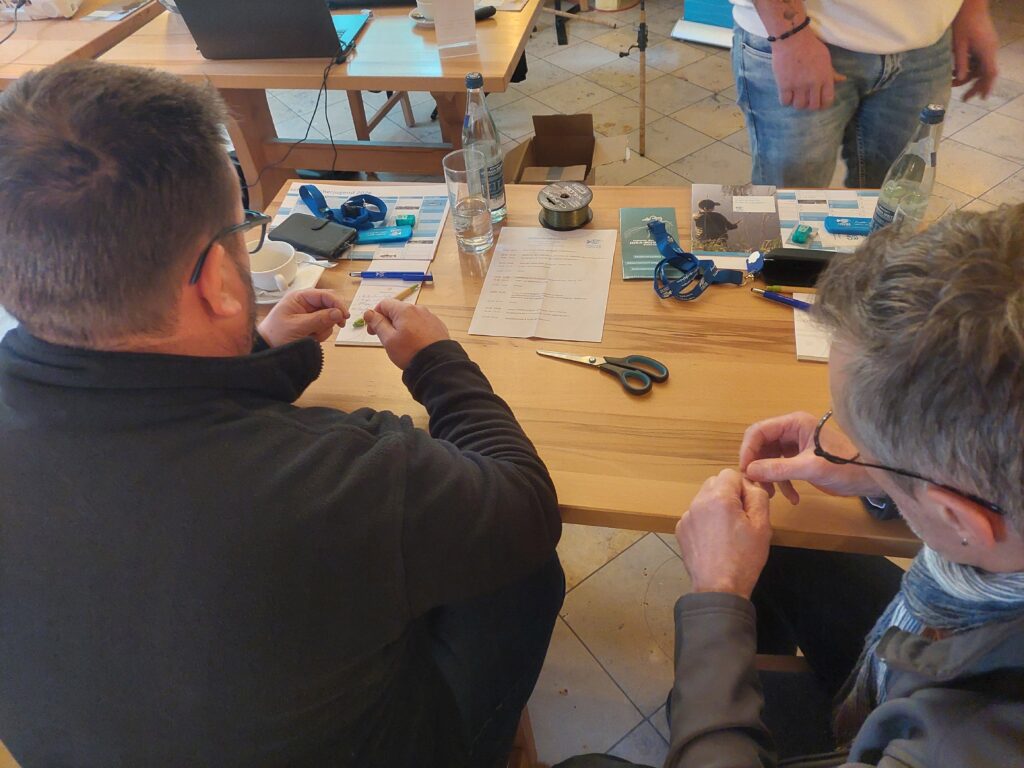 Durch Maßnahmen, wie dem eigenständigen Mischen von Anfutter, oder verschiedene Bastelaktionen entstehen tolle Gruppenstunden. Das fördert die Kreativität und stärkt nicht zuletzt das Gefühl der Selbstwirksamkeit beim Nachwuchs. Die Kinder und Jugendlichen lernen dabei, wie sie sich durch eigenes Handeln Material für ihr tolles Hobby herstellen können. Wenn sie damit dann am Wasser Erfolg haben, verstärkt sich dieser Effekt nachhaltig. Da es zum Thema „Futter einfach selbst gemacht“ passte, nahmen wir kurzfristig noch einen kleinen Beitrag zum Eigenbau eines sehr funktionalen Einhänge-Bissanzeigers ins Programm auf, den Dominik Hunoltstein vom Landesbüro vorstellte.